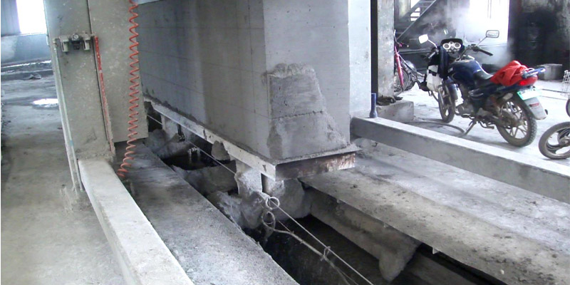 目前最流行的切割方式是機(jī)械切割,這種切割方式可以實(shí)現(xiàn)6面切割,切割產(chǎn)量大,廢料全部自動(dòng)流入回收水槽,最重要的優(yōu)點(diǎn)是2-3人就可以操作,省人工,切割精度高,適合年產(chǎn)5-20萬立方的加氣混凝土生產(chǎn)線。缺點(diǎn)是前期的投資比手動(dòng)切割要大,且需要配置回收水槽和廢料攪拌機(jī)。機(jī)械切割在使用時(shí)間長后會(huì)出現(xiàn)傳動(dòng)不同步,保養(yǎng)不好,切割時(shí)會(huì)出現(xiàn)雙眼皮和崩邊現(xiàn)象,而手動(dòng)切割卻沒有這樣的情況發(fā)生。