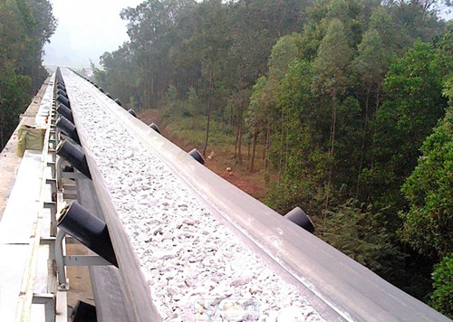 下面這張是皮帶輸送機現(xiàn)場圖片。采用的是品字形托輥組,以輸送礦物原料為主。