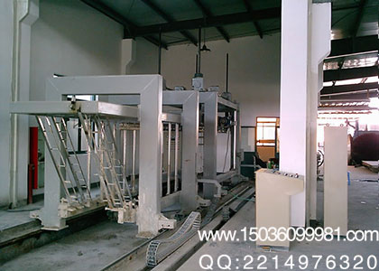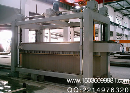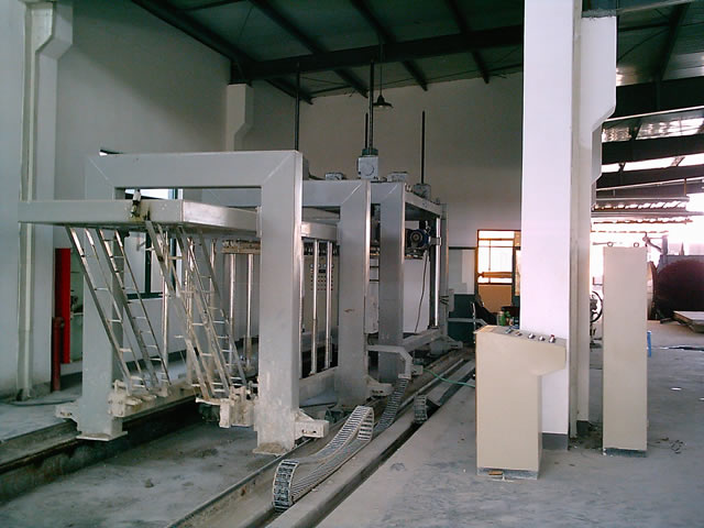 (2)坯體行走:預(yù)養(yǎng)好的坯體帶??罩蟹D(zhuǎn)90度,然后將坯體放在切割小車上或輥道上,由脫模機(jī)構(gòu)脫去模框。坯體通過小車或輥道行走進(jìn)行水平切割,切割好后坯體繼續(xù)前行至橫切位置定位,進(jìn)行橫向切割,切割好后前行由行車吊走坯體?!?