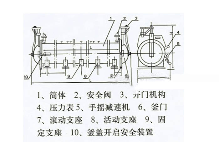 蒸壓釜設(shè)備主體部分主要由釜體裝置、覆蓋裝置、擺動(dòng)裝置、手搖減速器、安全裝置、支座、保溫層、密封裝置、管道閥門儀表等組成。附屬部分包括排水裝置。
