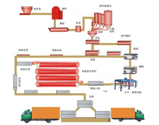 原料貯備倉(cāng)→(2)計(jì)量配料→(3)原料加水混合攪拌→(4)模具準(zhǔn)備→(5)澆注→(6)發(fā)氣靜停→(7)脫?!?)翻轉(zhuǎn),水平切割、垂直切割→(9)編組入釜→(10)高溫高壓養(yǎng)護(hù)→(11)成品出釜→(12)檢驗(yàn)成品→(13)包裝→(14)碼垛貯存→(15)出廠